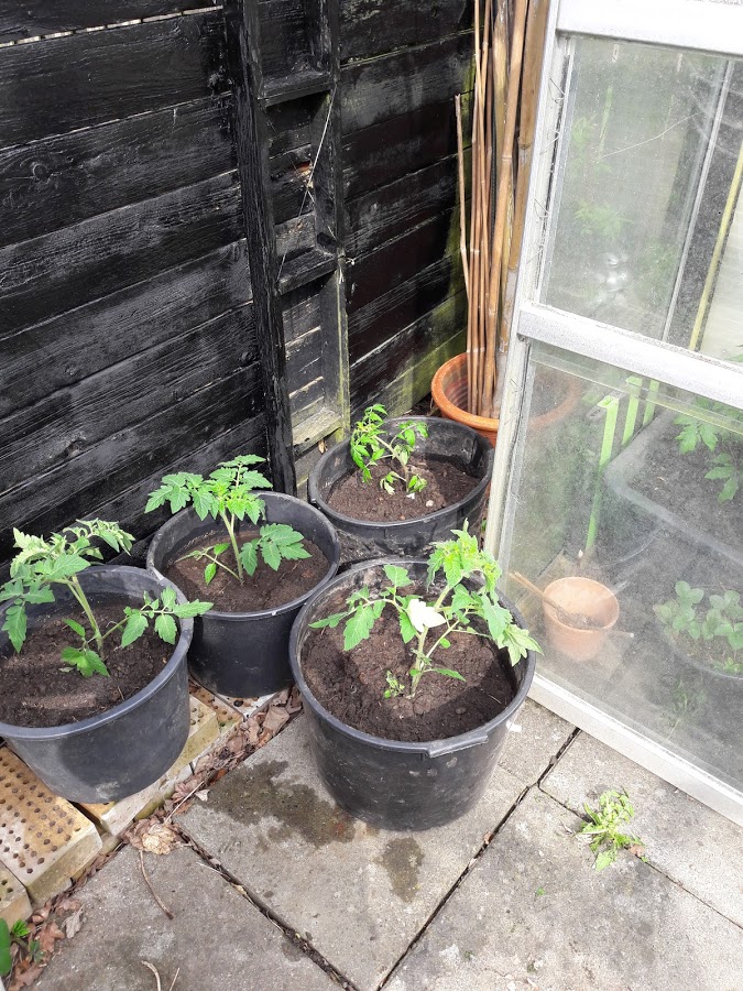 så fik jeg plantet mine sået tomatplanter ud i drivhuset og i store spande..